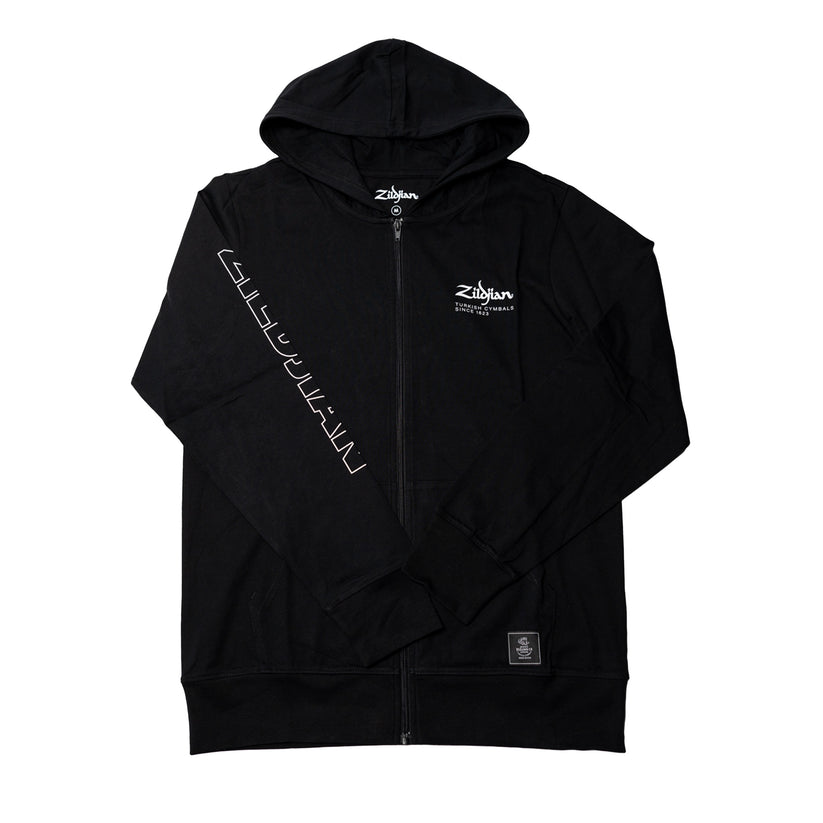 - Black hoodie with Zildjian logo on the left chest and "Zildjian" block letter print down the right arm