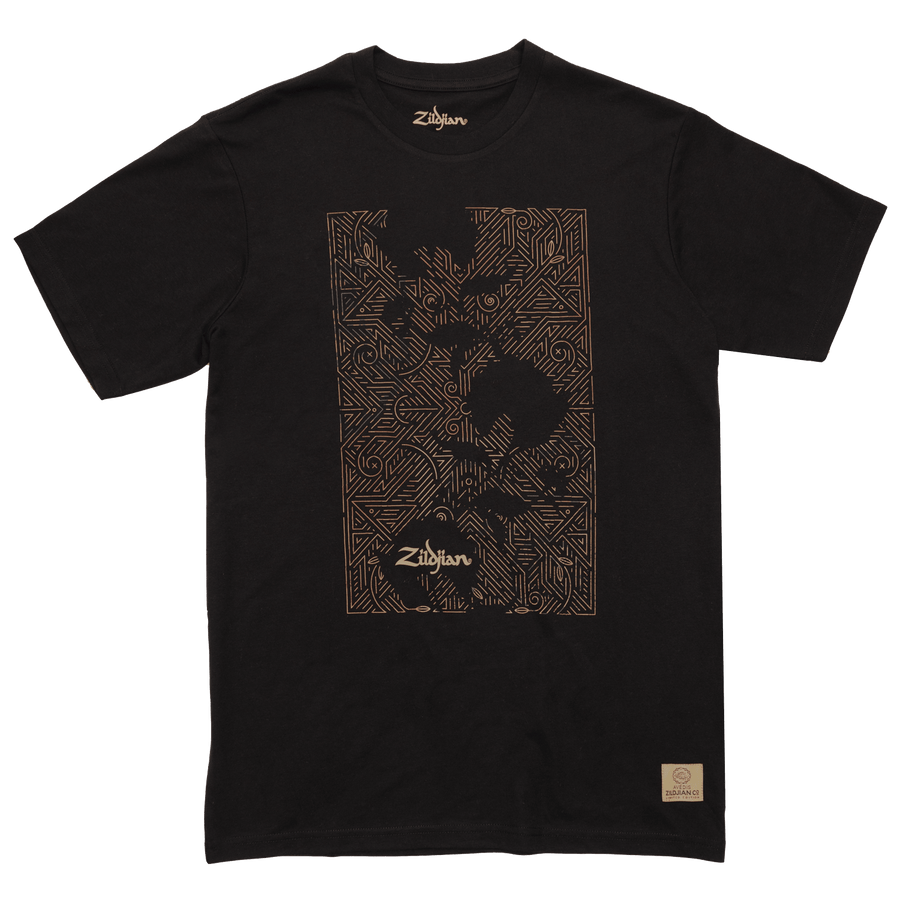 This limited edition Zildjian 400th Anniversary design pays tribute to the company's move from Turkey to the United States in the early 1920s. Avedis III, the only surviving male in the direct line of succession, left Turkey due to increasing oppression of Armenian people, becoming an American citizen. This led to officially moving operations to Quincy, Massachusetts in 1929. To honor this pivotal moment in our history and pay homage to our Armenian heritage, we've created a design that is equally dark and beautiful, inspired by Turkish design elements often seen in tiles and rugs of the same era. This soft, lightweight tee comes in unisex sizes small to 3XL, making it the perfect fit for every drummer.